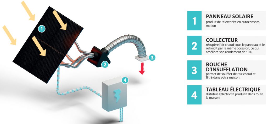 Le système d’autoconsommation énergétique via l’énergie solaire offre une possibilité de récupérer l’air chaud situé sous les panneaux pour la transformer en chaleur afin de la réinjecter dans certaines pièces de la maison. Le récupérateur d’air chaud, en plus de refroidir les panneaux photovoltaïques afin de favoriser la production, offre ainsi une possibilité d’avoir un chauffage d’appoint non négligeable pour réchauffer les pièces de la maison, notamment en hiver.